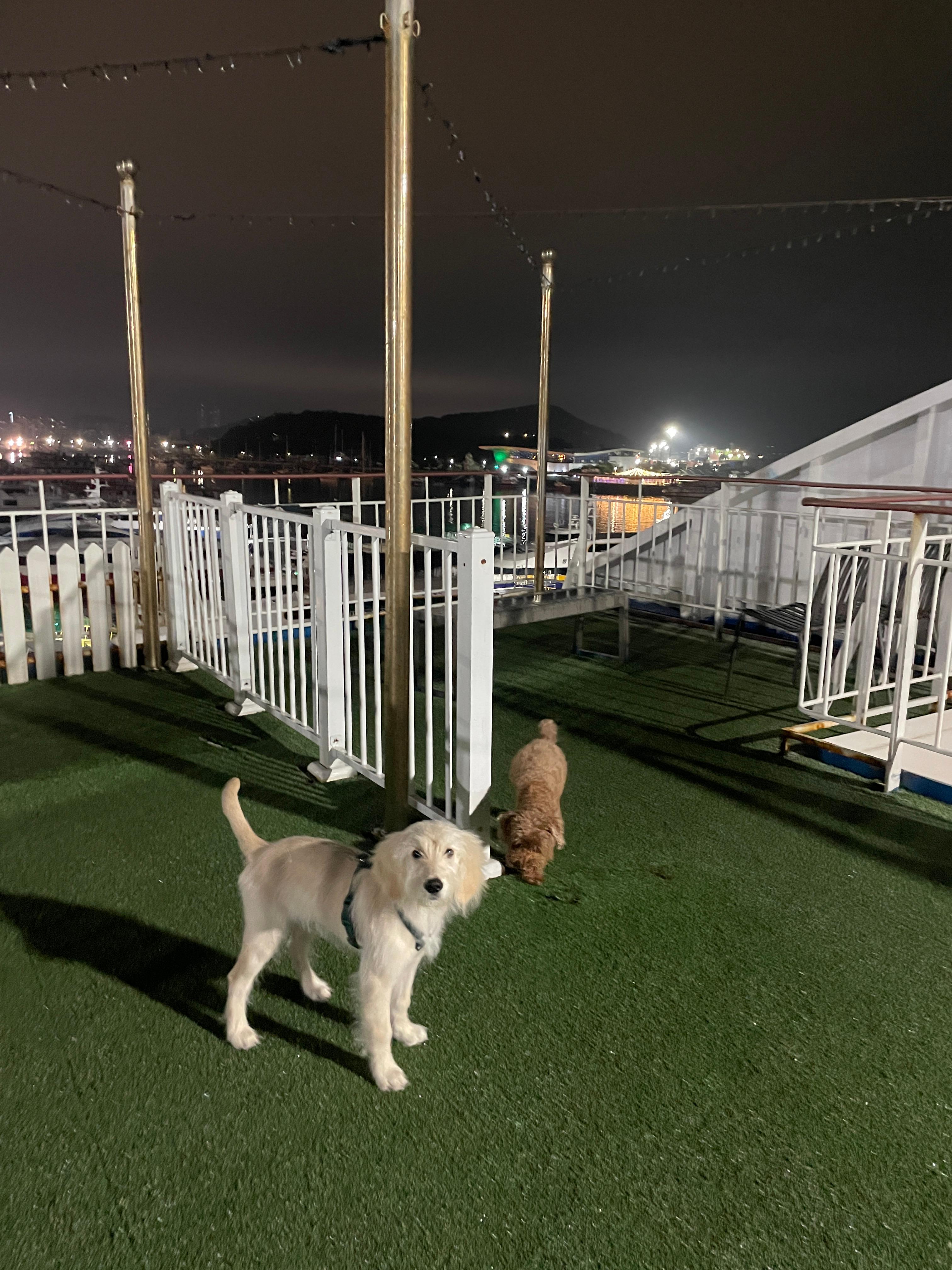 배 바깥쪽, 갑판 근처에 작지만 반려견 놀이터가 따로 있었어요!