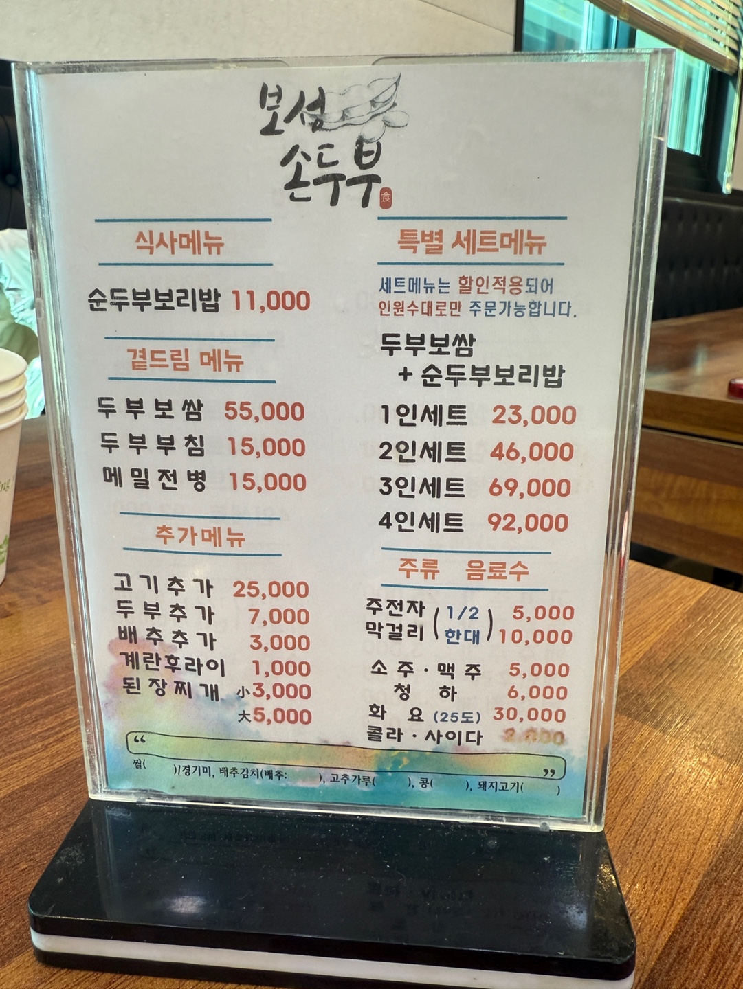 우리는 특별 세트메뉴(두부보쌈 + 순두부보리밥 3인 세트)**를 주문했어요!!ㅎ
