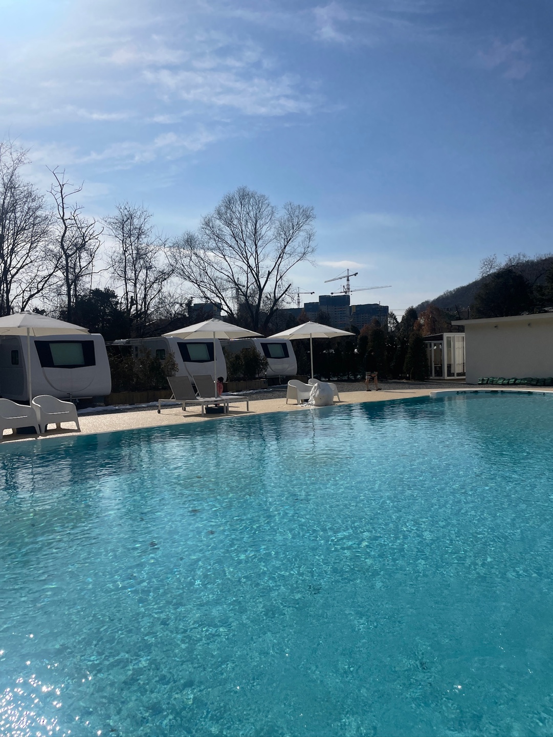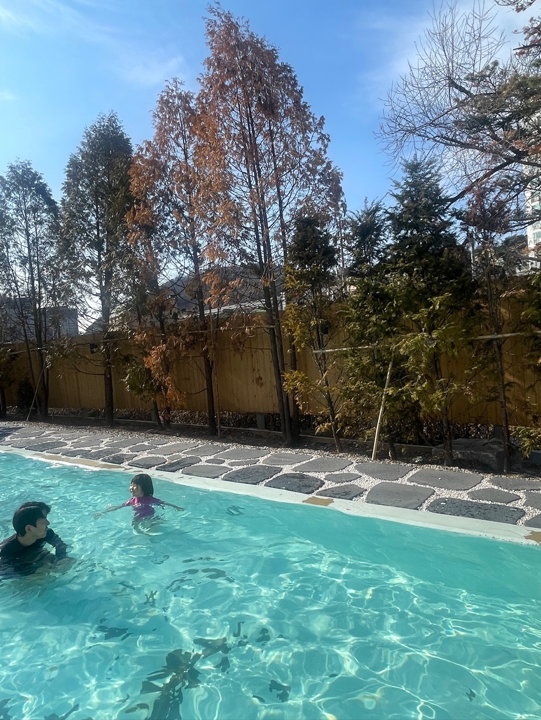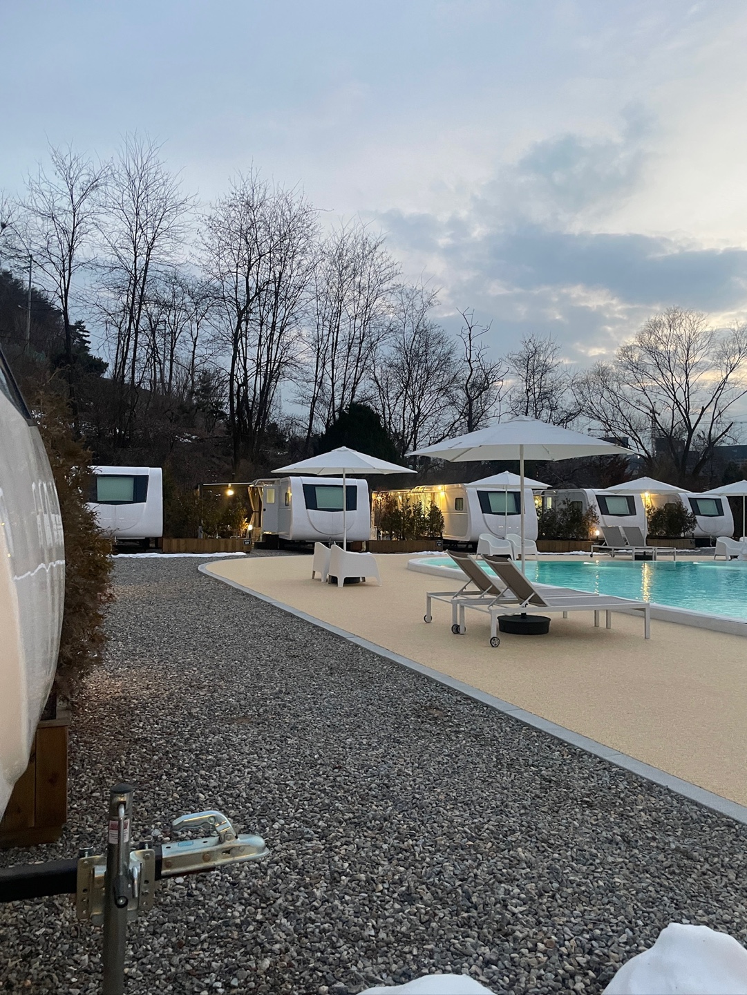 수영장은 넓고 깨끗하게 관리되어 있었으며, 따뜻한 물 덕분에 아이들도 감기 걱정 없이 물놀이를 즐길 수 있었습니다. 특히 물놀이를 좋아하는 아이들에게는 천국 같은 장소였어요! 하지만 겨울철에는 수영장이 야외에 있기 때문에 물놀이를 마치고 카라반으로 돌아갈 때 너무 추워서 서둘러 들어가야 했어요. 온수풀 덕분에 물속에서는 따뜻하게 놀 수 있었지만, 물 밖으로 나오면 차가운 공기에 조금 힘들기도 했답니다.