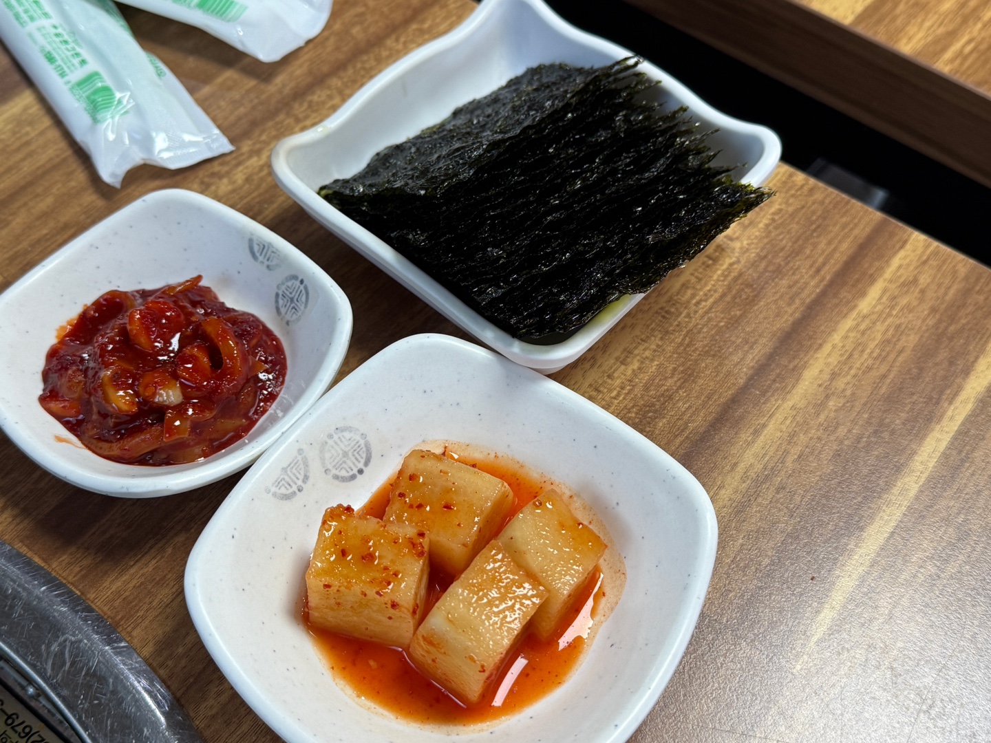반찬은 오징어젓갈, 김, 깍둑이만 나오는데 이상하게 더 맛있어요ㅎㅎ
